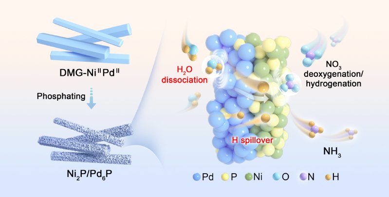 针对该领域的关键问题,陈忠伟院士与王新研究员合作发表题为“Boosting the Electroactivity of Porous Ni2P/Pd6P Nanorods for Nitrate to Ammonia through Hydrogen Spillover Effect”的研究论文。该文章在磷化镍催化剂中引入Pd元素,通过Pd的氢溢流效应抑制析氢副反应的发生,同时提高合成氨的选择性和产率。该方法为含氮污水治理提供新的思路,同时也是取代传统合成氨的新方法。