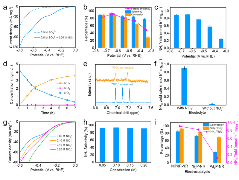 图3. Ni2P/Pd6P纳米棒催化硝酸盐还原合成氨的性能